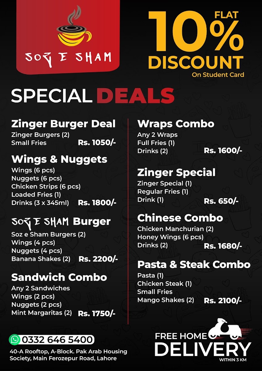 Welcome to Soz e Sham, an inviting café nestled atop the Pak-Arab Housing Scheme in Lahore. This trendy spot offers a delightful blend of flavors across its diverse menu, catering to both traditional and modern tastes.